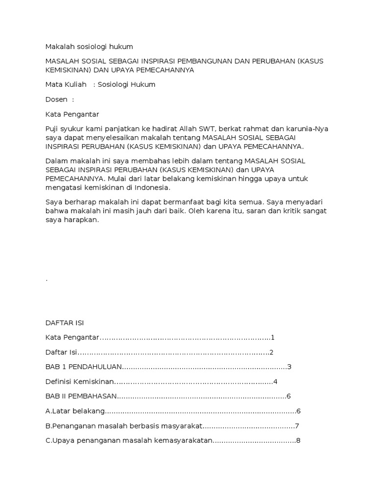 Contoh Makalah Sosiologi Hukum adalah makalah yang mungkin anda cari sebagai bahan contoh atau referensi dalam mengerjakan berbagai tugas makalah pelajaran atau mata kuliah yang berhubungan dengan Sosiologi dan Hukum atau mungkin anda sebenarnya sedang mencari referensi contoh seperti Makalah sosiologi hukum tentang KDRT Makalah sosiologi hukum tentang tawuran pelajar Makalah sosiologi hukum tentang kesadaran hukum Makalah sosiologi hukum tentang hukum dan kemiskinan Makalah sosiologi. 1 Alam pikiran manusia dalam dunia sosial ditentukan oleh prinsip hubungan timbal balik dalam memberi dan menerima sehingga tampak jelas bahwa manusia menciptakan dunia sosial pada hakekatnya justru akan memperbudak. Nama lokasi atau tempat dari beberapa contoh judul proposal di atas memang sengaja disamarkan untuk memberi ruang kebebasan pada pembaca mau riset di daerah mana.