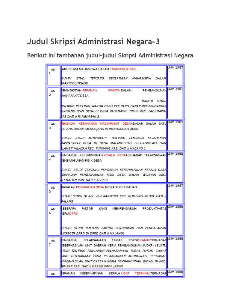 Contoh judul skripsi administrasi negara terbaru. Bagi kamu yang sudah atau akan mengambil skripsi dan merasa tidak berdaya dengan pembuatan judul skripsi. Jasa Skripsi Malang juga melayani beragam jurusan yang tersedia di. 53 Contoh Judul Skripsi Ilmu Pemerintahan Terbaru 53 Contoh Judul Skripsi Ilmu Pemerintahan Terbaru berikut ini kami berbagi kepada para mahasiswa i yang sudah merencanakan untuk mengajukan judul skripsi.