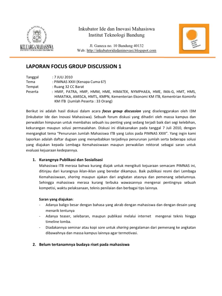 1 Ciri-ciri FGDo FGD di ikuti peserta yg idealnya 7 -11 org peserta FGD baiknya berjumlah ganjil. Contoh laporan kegiatan jika kita bekerja atau memiliki kegiatan di organisasi atau instansi misalnya kita pasti melakukan berbagai kegiatan. Labora_psikologiumaacid Demikian pemberitahuan.