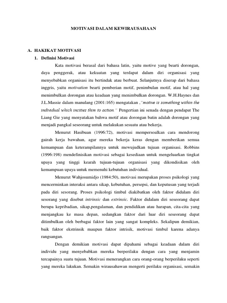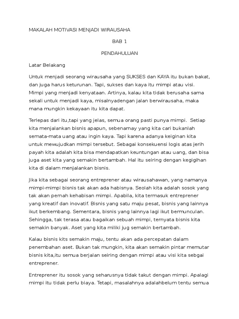 Makalah motivasi kewirausahaan pdf. Penumbuhan minat wirausaha tidak dapat dilakukan serta merta tanpa adanya pendidikan dan pelatihan yang dapat meng-gerakkan jiwa kewirausahaan seseorang. Hasil akhir dari proses tersebut adalah penciptaan usaha baru yang dibentuk pada kondisi risiko atau ketidakpastian. Penurunan motivasi berwirausaha juga dapat terjadi ketika individu mengalami kegagalan untuk pertama kalinya.