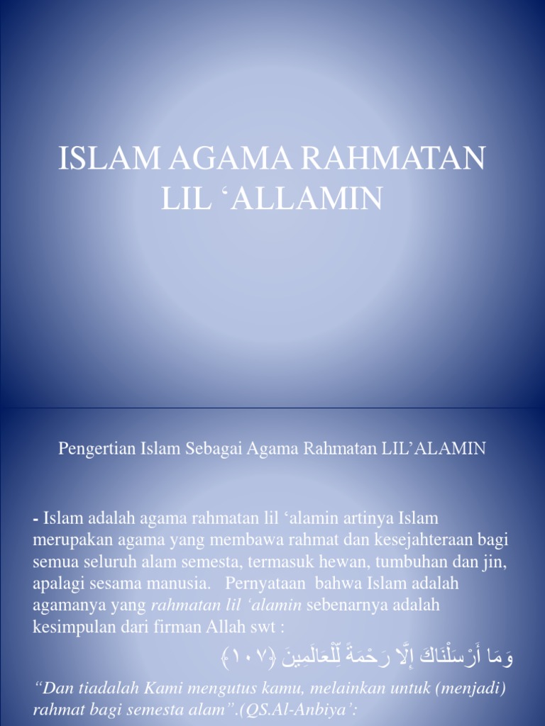 Pengertian islam rahmatan lil alamin adalah. ISLAM RAHMATAN LIL ALAMIN Disusun oleh. Mahasiswa Pascasarjana IAIN Ar-Raniry. Alam semesta secara umum mendapat manfaat dengan diutusnya Nabi Muhammad Shallallahu alaihi Wa sallam.