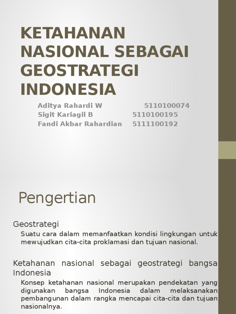 Dengan kata lain geostrategi bangsa Indonesia diwujudkan melalui konsep Ketahanan Nasional. KETAHANAN NASIONAL SEBAGAI GEOSTRATEGI INDONESIA. Berdasarkan pendapat di atas terdapat tiga pengertian ketahanan nasional atau disebut sebagai wajah ketahanan nasional yakni.